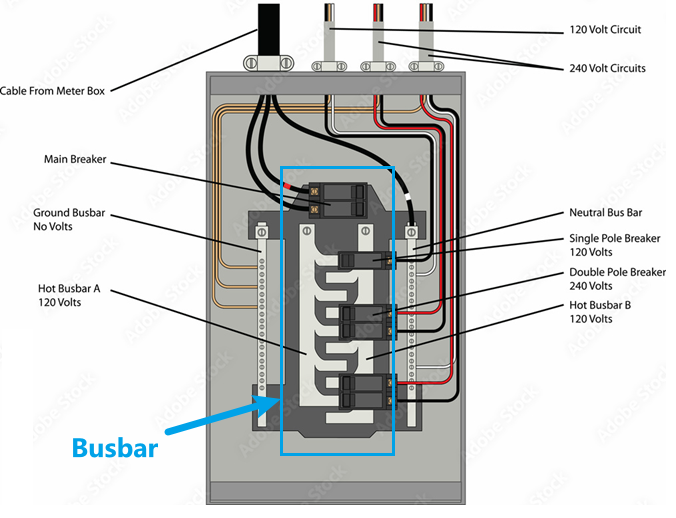 A busbar is a thick, conductive metal strip (copper or aluminum) inside an electrical panel that acts as a central hub to collect and distribute power from the main service to various circuit breakers for a building's circuits.