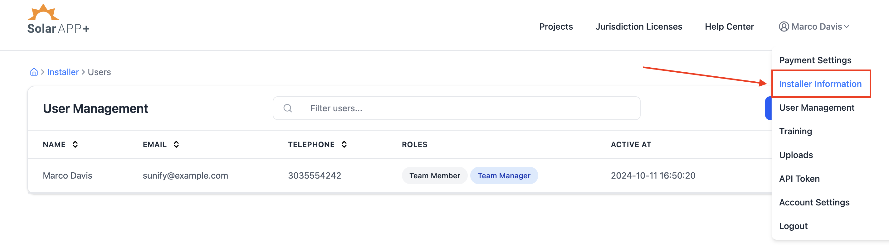 - When logged into SolarAPP+, select "Installer Information" from your account drop-down.