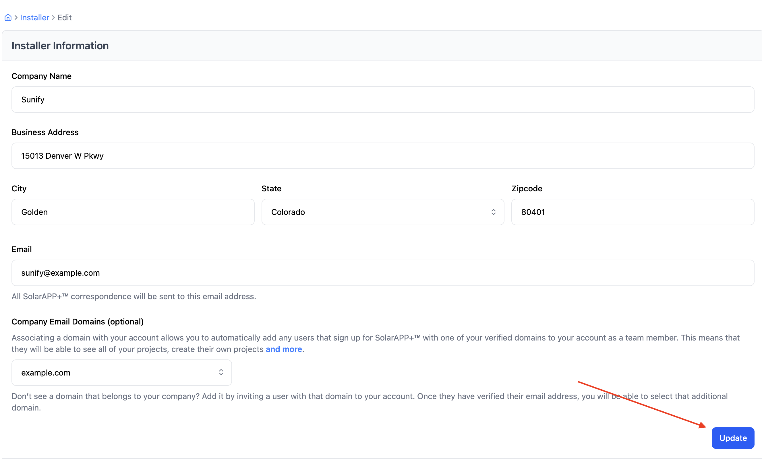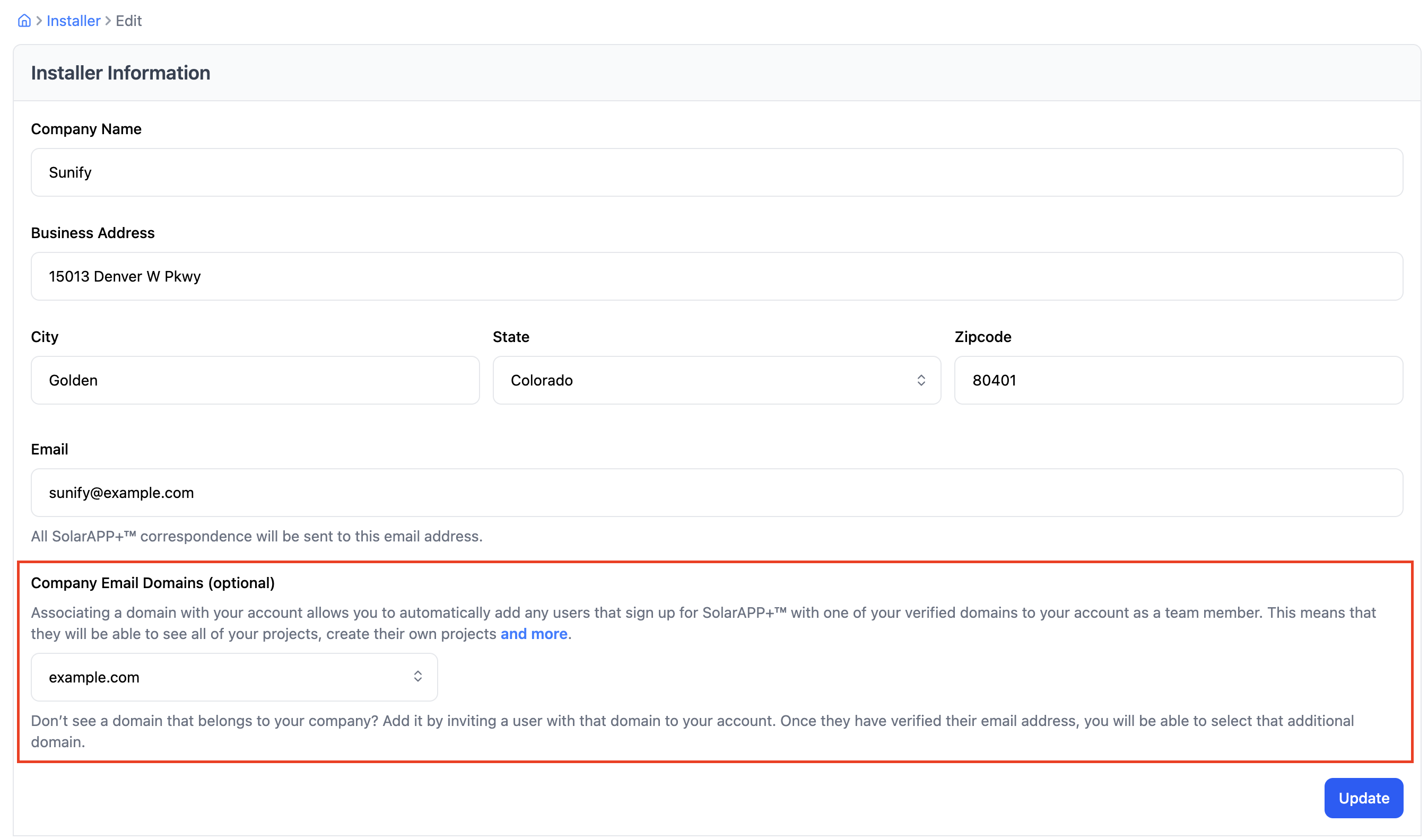 Team Managers can now assign a company domain to your organization’s SolarAPP+ profile. This feature automatically links any user signing up with this domain to your company, so you no longer need to invite each new addition manually.