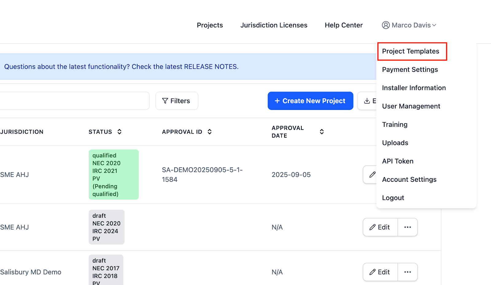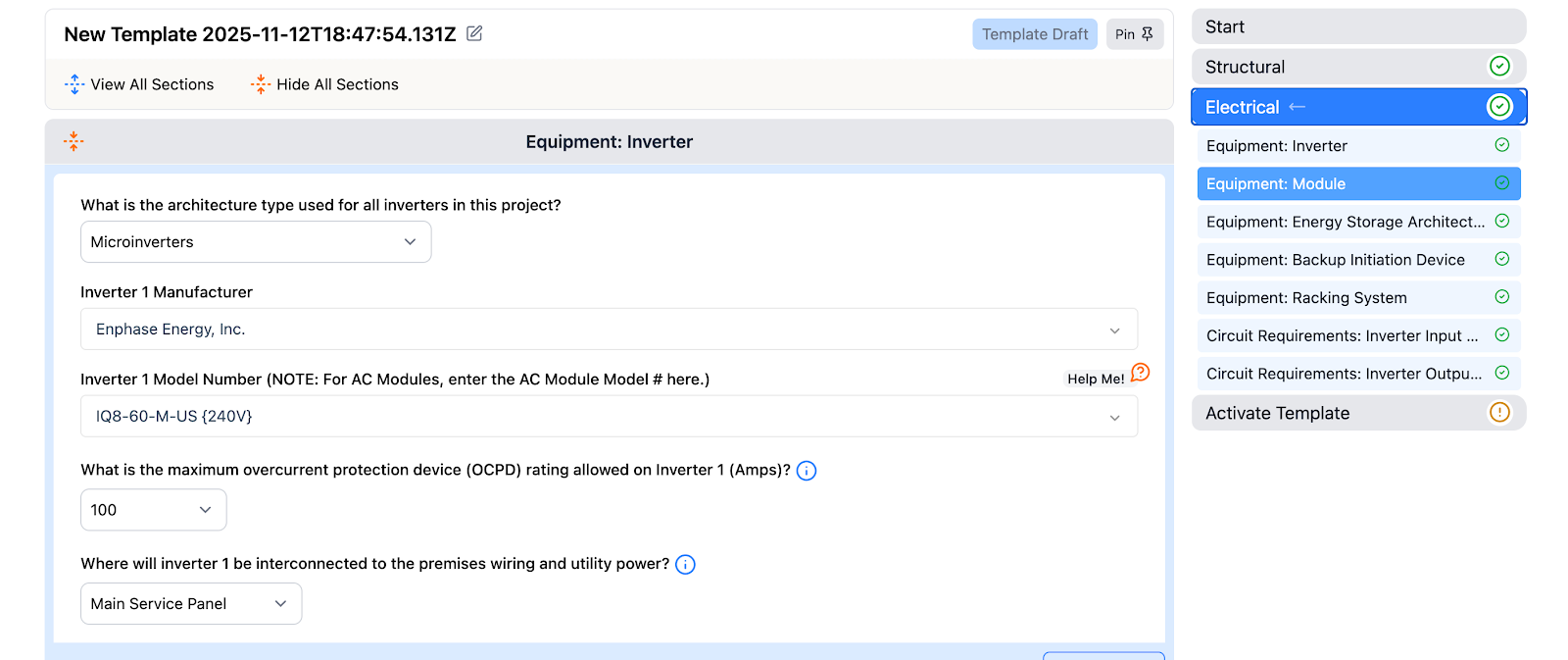 - Project-specific details – address, property owner information, jurisdiction selection, existing equipment, structural assessments, electrical service specifications, and design calculations