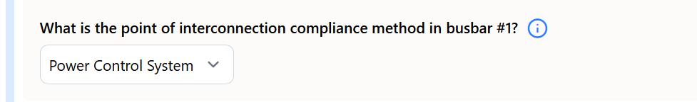 In SolarAPP+, the installer selects Power Control System as the point of interconnection compliance method at the busbar level.