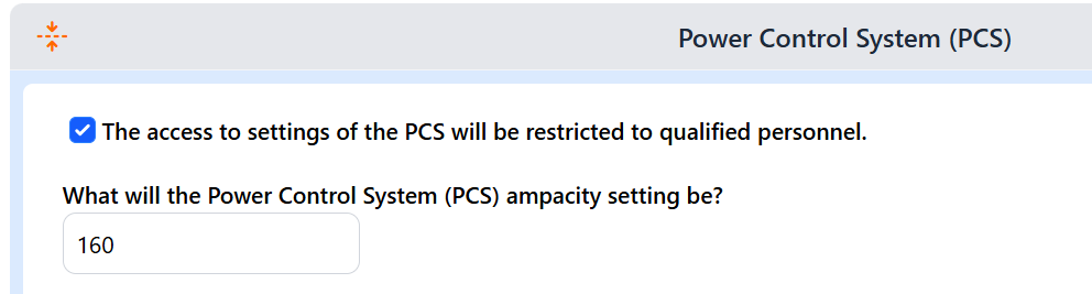 Example: For a 200A main service breaker, the PCS ampacity setting should be: 200A × 80% = 160A